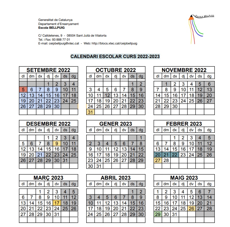 Hola famílies, en el Consell Escolar del dia 14 de juny es va aprovar el Calendari escolar del Curs 22-23. Aquí el teniu perquè el pugueu consultar. CALENDARI ESCOLAR CURS 22-23