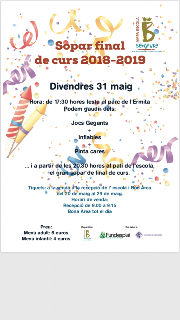 Benvolgudes famílies, Us informem de les dates de les reunions d’aula amb les famílies i us animem a participar. Us donarem a conèixer el funcionament de les aules, les dinàmiques de treball i les activitats i sortides que farem amb els vostres fills i filles al llarg del curs. És molt important la vostra assistència, […]