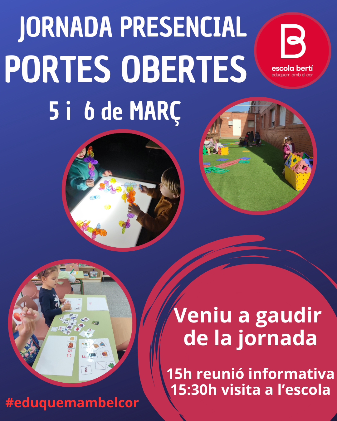 Us convidem a la nostra Jornada de Portes Obertes, una oportunitat única per descobrir la nostra escola, conèixer el nostre projecte educatiu i veure de primera mà com acompanyem l’aprenentatge i el creixement dels nostres alumnes.
