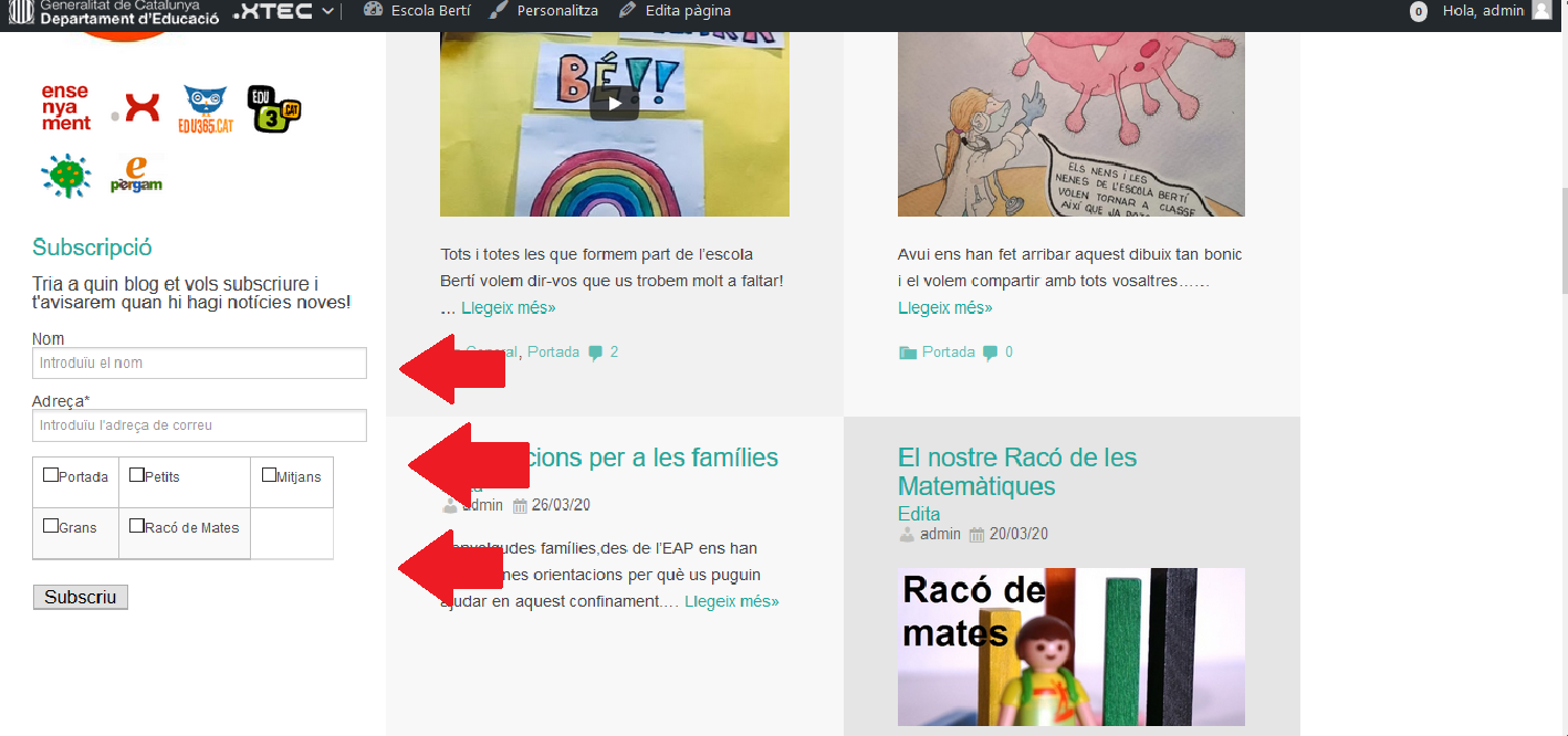 hem solucionat el problema de subscripció als diferents blogs de la pàgina web. Segurament si aquests dies us intentàveu subscriure a un blog que no fos el de la pàgina d’inici us sortia un error que deia que el vostre usuari ja existia…Ara ja està solucionat. Només heu de tornar a posar nom i l’adreça i marcar a quin blog us voleu subscriure. Si ja estàveu subscrits al de la Portada (pàgina inici) no cal que el marqueu.