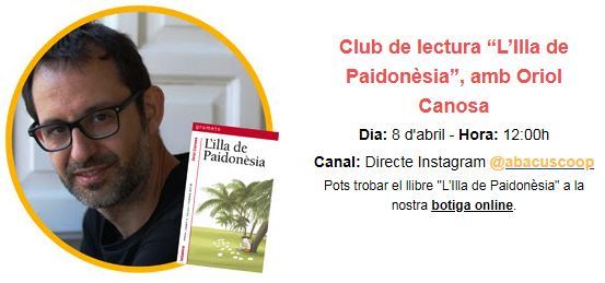 ACTUALITZACIÓ (8-4-20) – Finalment no ha pogut ser, l’Abacus ha informat que, per circumstàncies personals, no es podria fer el Club de Lectura amb l’Oriol Canosa en directe. Si fos el cas, més endavant tornarien a avisar. Llàstima. Però estarem alerta!