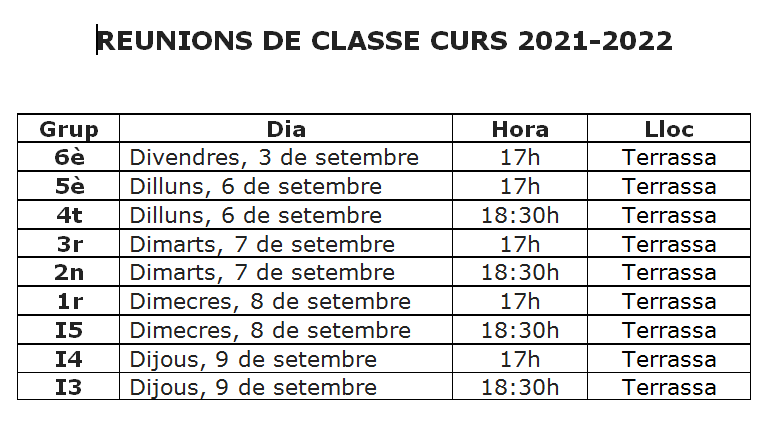 A continuació, en referència al proper curs 2021-22, us deixem el quadre amb les dates i els horaris de les reunions d’inici de curs, així com el llistat de material que cal portar de cada nivell. Esperem que aquesta informació us sigui d’utilitat.