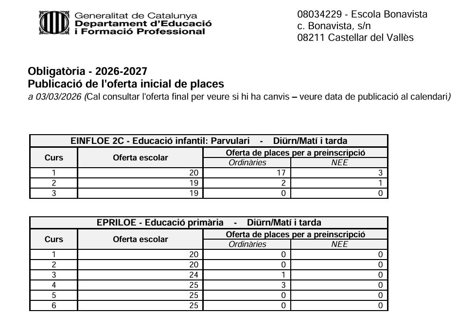 PREINSCRIPCIÓ 2026-27 OFERTA INICIAL DE PLACESPer admin / 4 de març de 2026 / General Portada ENLLAÇ A LA WEB DE GENCAT PER FORMALITZAR LA PREINSCRIPCIÓ ACCÉS PREINSCRIPCIÓ