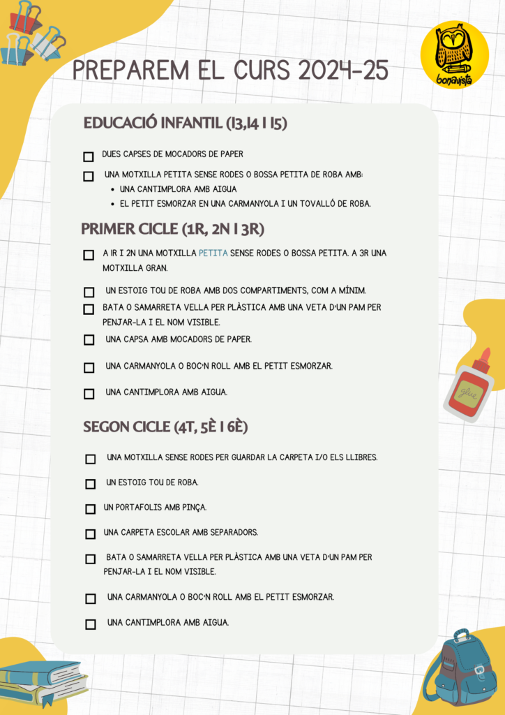PREPAREM EL CURS 2024-25Per admin / 3 de juliol de 2024 / Famílies Infantil Portada Primària QUÈ CAL PORTAR EL PRIMER DIA?