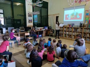 Aquesta setmana ens ha visitat la Marta Puig, exalumna de l’escola, i qui ha fet la il·lustració de la guia de lectures d’aquest Sant Jordi. Alumnes de tots els grups, un parell de cada classe, van poder descobrir de primera mà com s’ho fa la Marta per passar de la idea a la producció final.