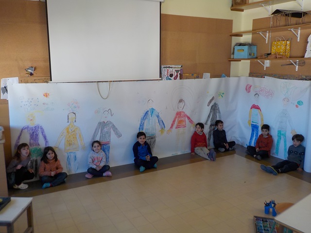 HEM   RESSEGUIT  EL  NOSTRE COS  EN UN  PAPER A LA PARET.  L’HEM  PINTAT  AMB  CERES IGUAL COM  ANÀVEM  VESTITS.
