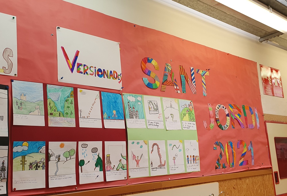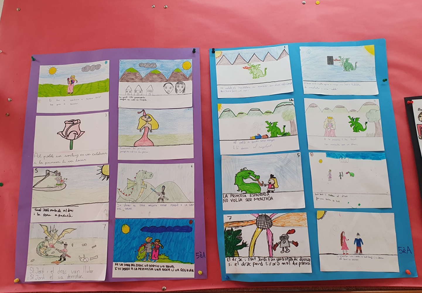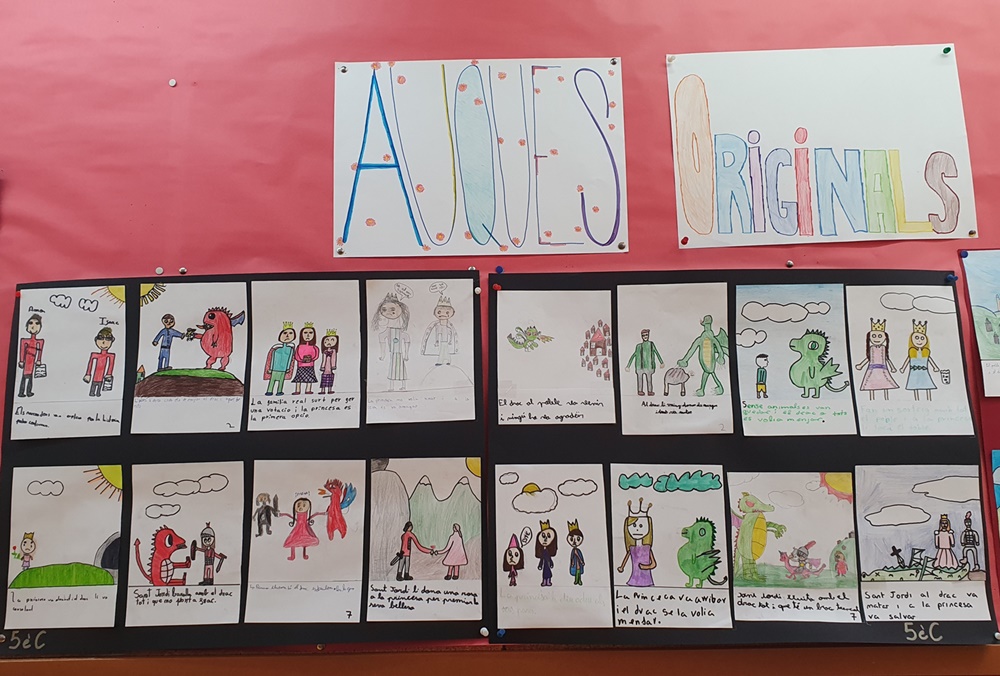 A partir de la llegenda de Sant Jordi original i la versió que van fer en anglès, cada classe ha creat la seva auca i cada nen/a la seva vinyeta.