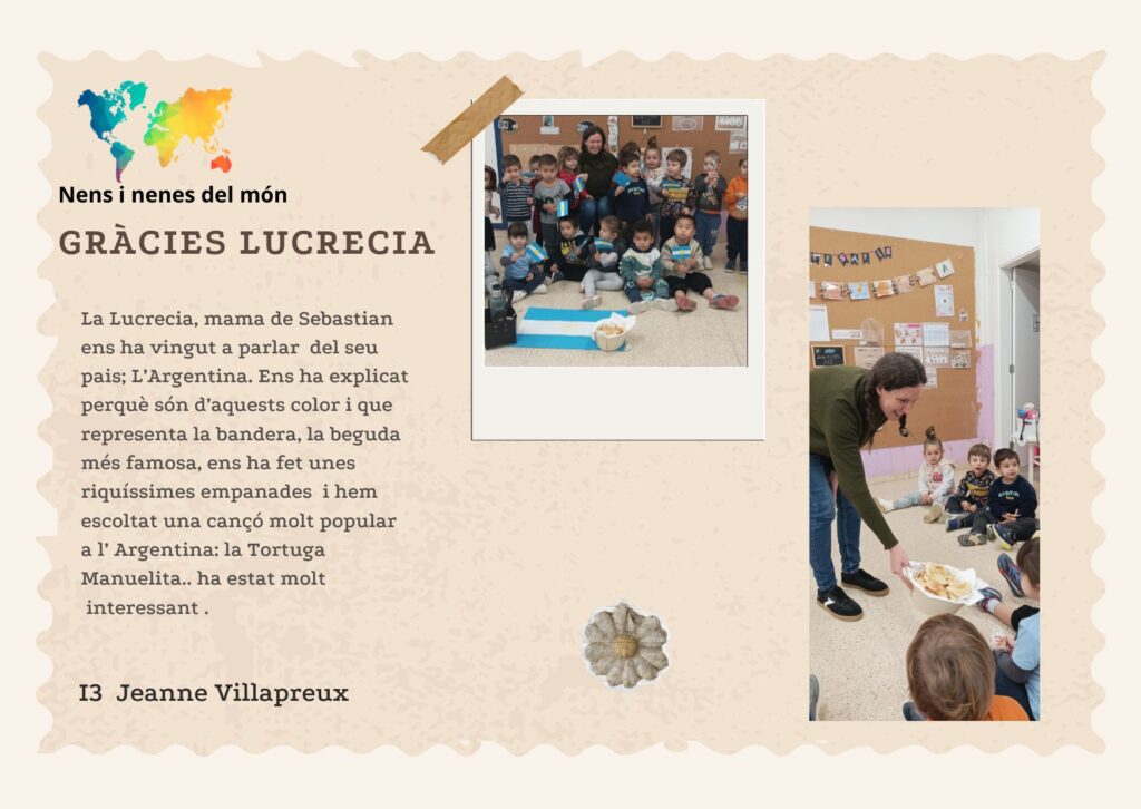 Durant el mes de Novembre a I3 ens hem apropat al coneixement del diferents països i cultures que tenim a la nostra aula. La Lucrecia i la Patricia, mama de Sebastian i Robert ens han visitat i ens han explicat coses molt interessant; La Lucrecia ens ha explicat l’origen i significat de la bandera, els menjar típic, la beguda més coneguda i les cançonetes més populars de l’Argentina i la Patricia ens ha explicat l’origen i com es celebren i els actes més rellevant de les Falles: la nit del foc, la cremà, l’ofrena floral, els vestits típics, els ninots…
