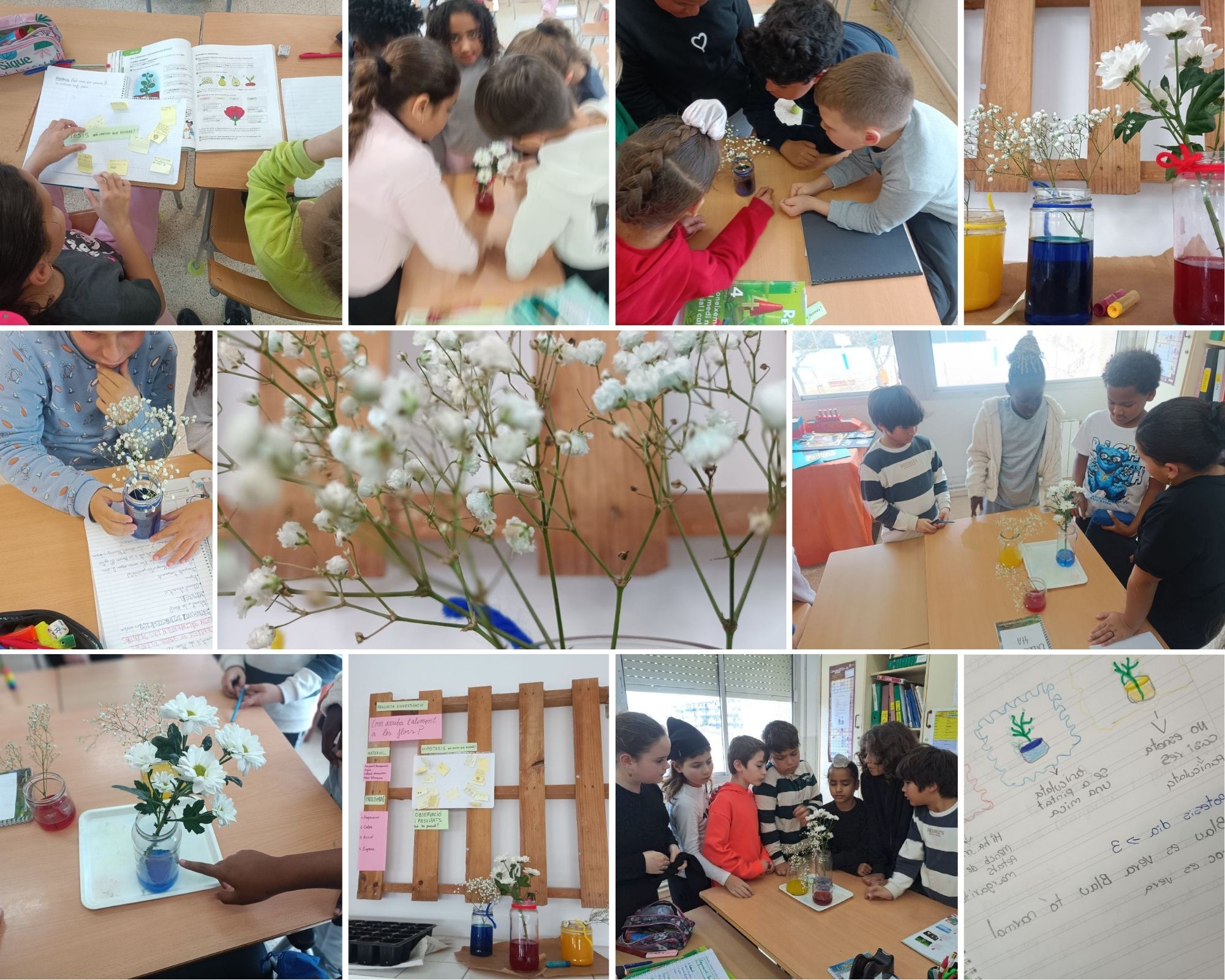 A l’aula ens hem plantejat una pregunta clau: com arriba l’aliment a les flors? Per donar-hi resposta, hem realitzat un experiment aplicant els passos del mètode científic. Vam formular les nostres hipòtesis i vam preparar flors blanques amb aigua i colorant alimentari per poder aprofundir en la fotosíntesi i l’alimentació vegetal.