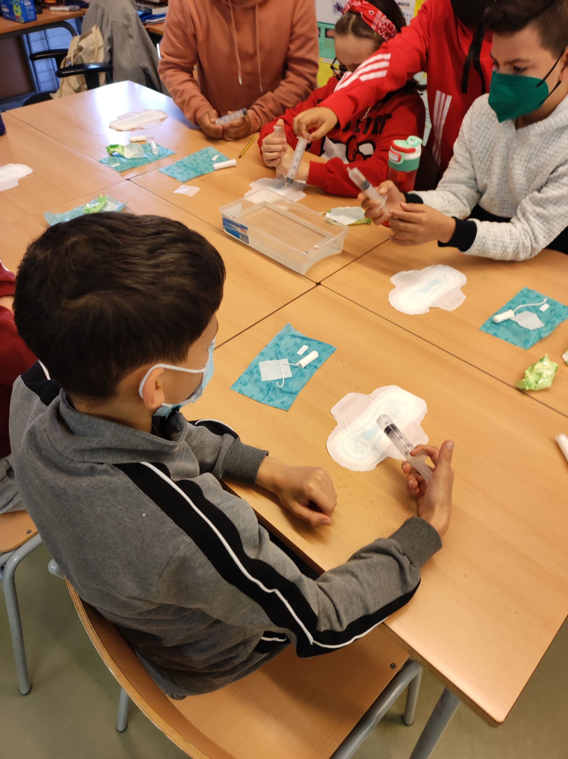 A cinquè la menstruació comença a ser un tema que es comença a sentir, però que molts no en volen parlar. Per aquest motiu aquest trimestre hem fet unes jornades per a parlar-ne, ja que aquest és un tema de tots i que tothom ha de poder conèixer. Hem vist un vídeo explicatiu del Info-K, hem pogut veure i tocar copes menstruals, tampons i compreses i quan ja teníem tots els dubtes resolts hem experimentat amb els tampons i compreses.