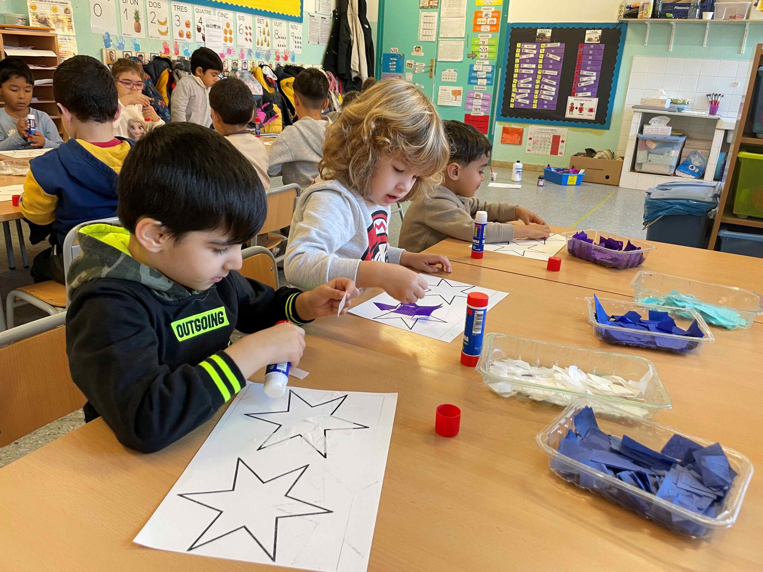 Les Festes de Nadal s’acosten… i fa dies que estem assajant la cançó amb molta il·lusió per a vosaltres! I Perquè quedi ben bonica la presentació hem decorat unes estrelles amb els colors de l’hivern i purpurina.