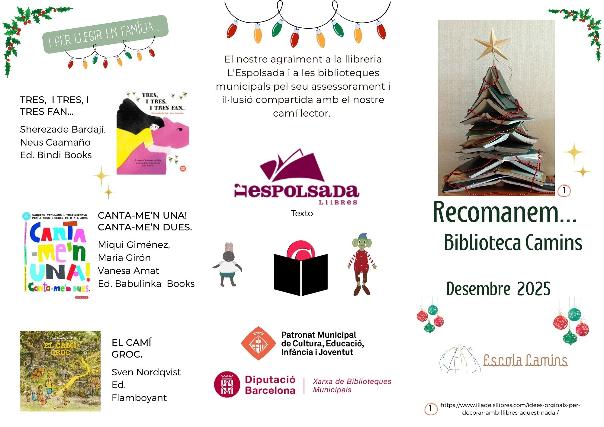 Com cada any per Nadal, a l’escola Camins us fem arribar les recomanacions de lectures a través d’aquest tríptic que els vostres fills/es porten casa en paper perquè així pugueu conversar sobre els llibres. La selecció que teniu en aquesta publicació ha estat gràcies al treball de les Biblioteques Municipals i de la llibreria L’Espolsada.