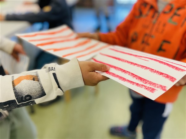 Abans de continuar el procés, fem una aturada i ens mostrem els resultats. Gaudim dels colors triats i els traços dels companys i les companyes i fem un pas més: ens intercanviem un dels nostres resultats. Generem noves incerteses en el procés creatiu.