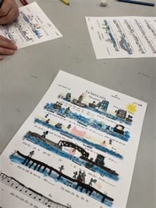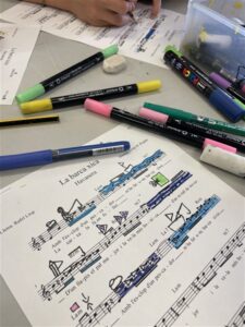 En aquest cas, la partitura d’una cançó treballada a la classe de música es converteix en el suport principal de l’acció artística. Les notes, els pentagrames i els espais del paper s’han convertit en elements del dibuix, transformant la partitura en una nova escena.