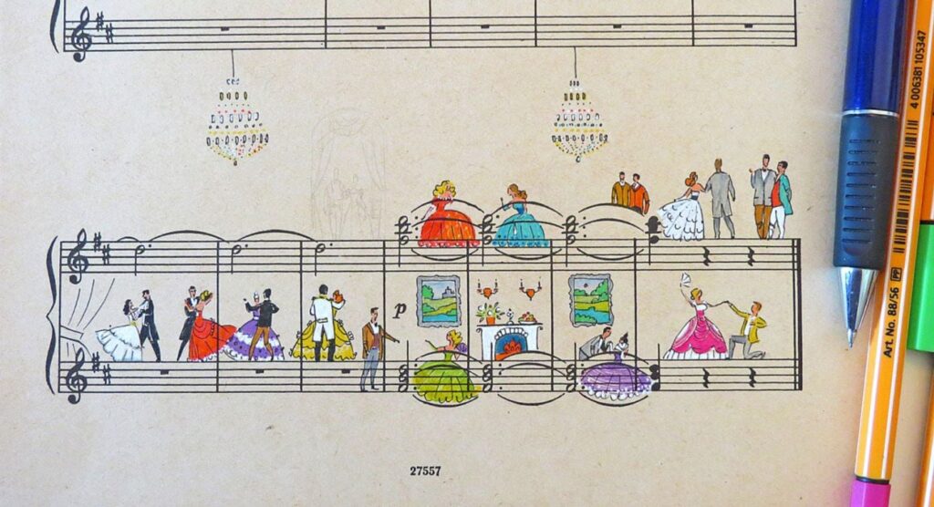 La notació musical és una forma d’escriptura molt especial: mentre que els músics hi llegeixen melodies i ritmes, moltes altres persones només hi veuen punts i línies. Lena Erlich, però, interpreta les notes i els pentagrames com si fossin un paisatge on es poden imaginar i dibuixar històries.