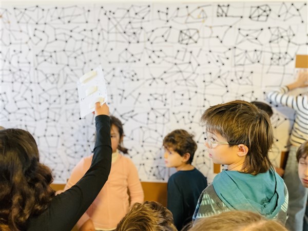 Soc estrella. Som constel·lació. UNIVERS CAMINS. L’acció artística i col·laborativa entre padrins i fillols de l’escola que acaba amb una instal·lació al vestíbul. Moments únics de final de trimestre que fan escola. Escenes irrepetibles de lligam, converses i connexions entre infants.