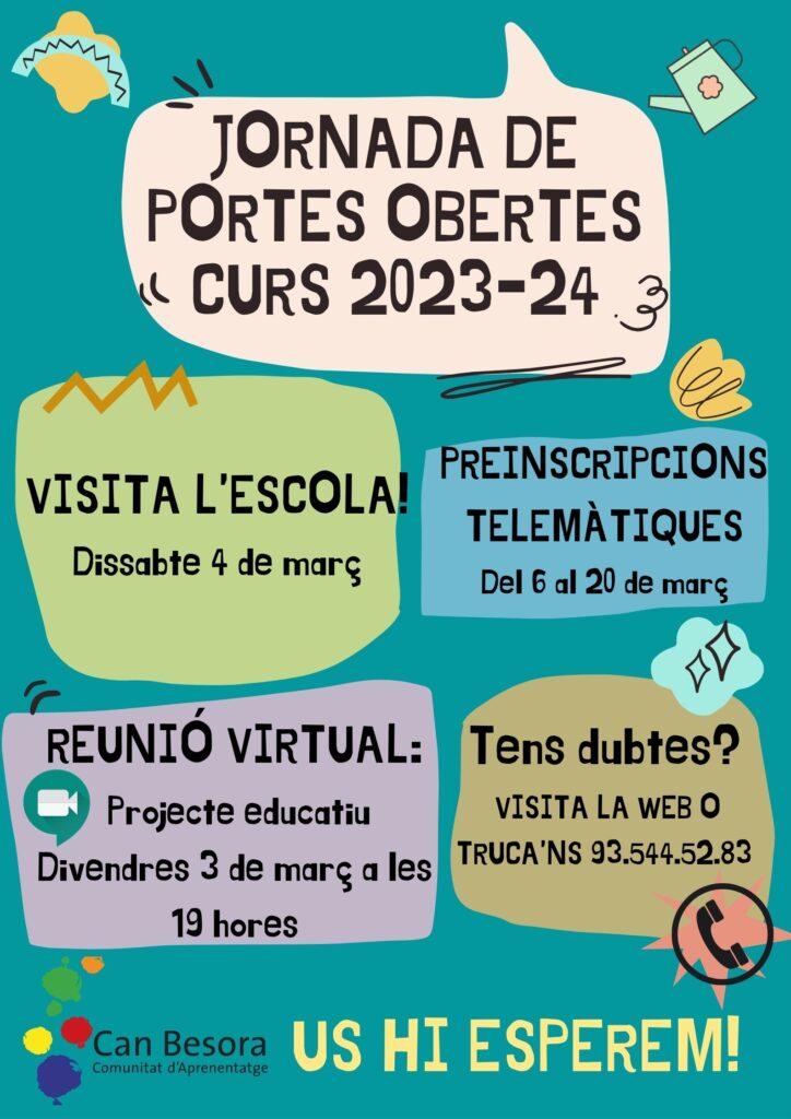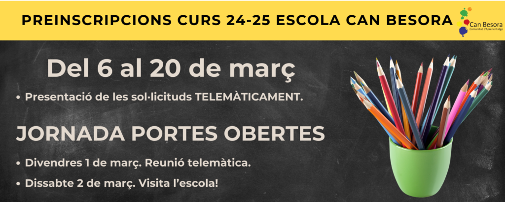 APUNTEU-VOS EN AQUEST FORMULARI! Benvolgudes famílies, Us informem que la jornada de Portes Obertes de l’Escola Can Besora s’organitzarà de la manera següent: Xerrada virtual sobre el projecte educatiu: divendres 6 de febrer a les 19.00 h. Visita a les instal·lacions: dissabte 7 de febrer, de 10.00 a 12.00 h, en franges de 30 minuts. Per a qualsevol aclariment, podeu contactar amb nosaltres a canbesora@canbesora.com. […]