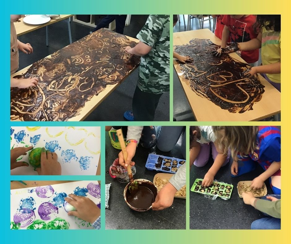 També ens ha agradat molt fer la nostra creació artística estampant diferents aliments com la ceba, el pebrot, la llimona o els cabdells d’enciam.