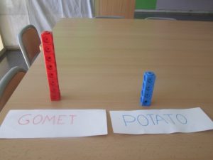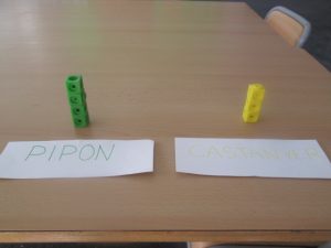 ES VAN PROPOSAR DIFERENTS NOMS I ELS VAM ESCRIURE TOTS A LA PISSARRA. CADASCÚ VA VOTAR UN NOM I ES VAN ANANT APILANT CUBS D’UN MATEIX COLOR PER A CADA NOM. EL NOM QUE TENIA MÉS CUBS, VA SER EL GUANYADOR!
