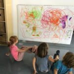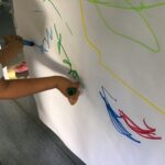 Vam seguir escoltant la música mentre pintavem amb les dues mans alhora un gran mural, va ser un gran repte coordinar els moviments, però ho vam anar aconseguint.