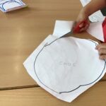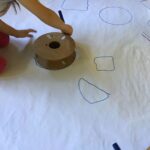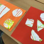 Vam girar el mural i vam marcar diferents formes lliurement.  Per acabar les vam retallar i cadascú les va enganxar en un full de color per a fer la seva propia creació.