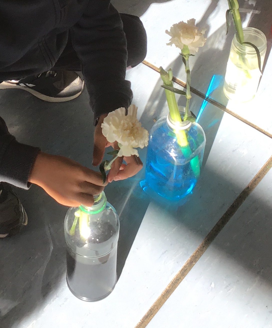 Aquest segon trimestre l’hem engegat fent moltes activitats d’investigació i d’experimentació per tal de conèixer i entendre com són els arbres i les plantes, quines són les seves parts i funcions, així com creixen i què necessiten per viure. Hem preparat diferents recipients amb aigua i colorants i hem submergit apis i clavells. D’aquesta manera, hem pogut comprovar com aquestes plantes absorbeixen l’aigua i gràcies al color és més fàcil veure com aquesta es distribueix per la tija a tota la planta. També hem pogut reflexionar sobre que algunes plantes es poden menjar i d’altres no.