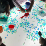Com a segona experiència, hem jugat a la taula de llum amb boles d’hidrogel de colors freds. El seu tacte humit, elàstic i lliscant ha estat el complement perfecte per treballar la psicomotricitat fina mentre les intentaven agafar, omplir i transvasar en diferents recipients.