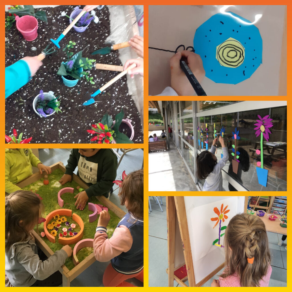 Hola famílies!! Les Fades i els Follets estem descobrint coses de la primavera i estem fent moltes activitats relacionades amb aquesta estació de l’any. Hem fet flors amb goma eva i també amb papers de colors per decorar els vidres de la nostra classe. També hem descobert les taules d’experimentació que tindrem aquestes setmanes, plenes de terra, testos i eines per plantar plantes de plàstic i també de fideus tintats de verd amb flors i papallones. Ah!, i com que som una colla d’artistes hem fet quadres de primavera amb els cavallets. Ens encanta aquesta època!!