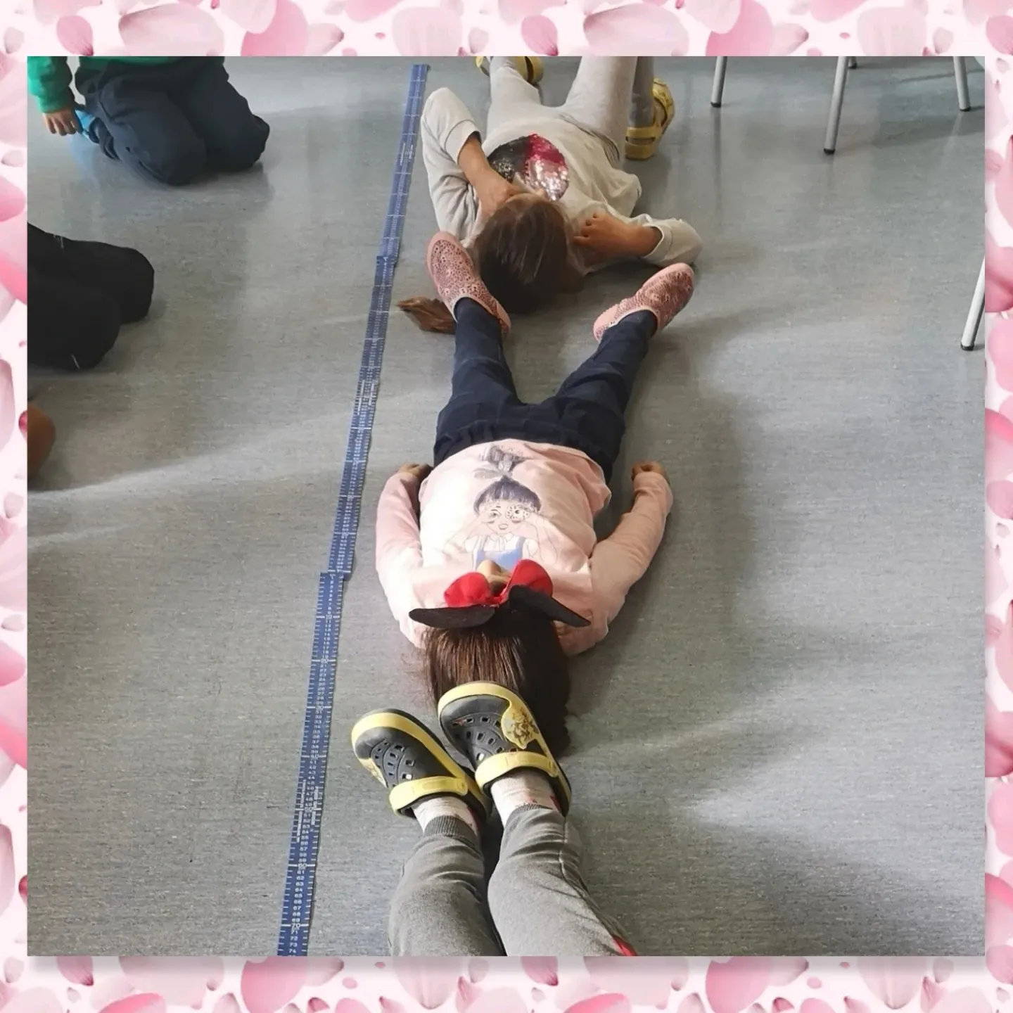 Després de saber quants metres medeixen, els representem al terra amb cintes mètriques i mirem quants nens i nenes necessitem per fer aquestes llargades.