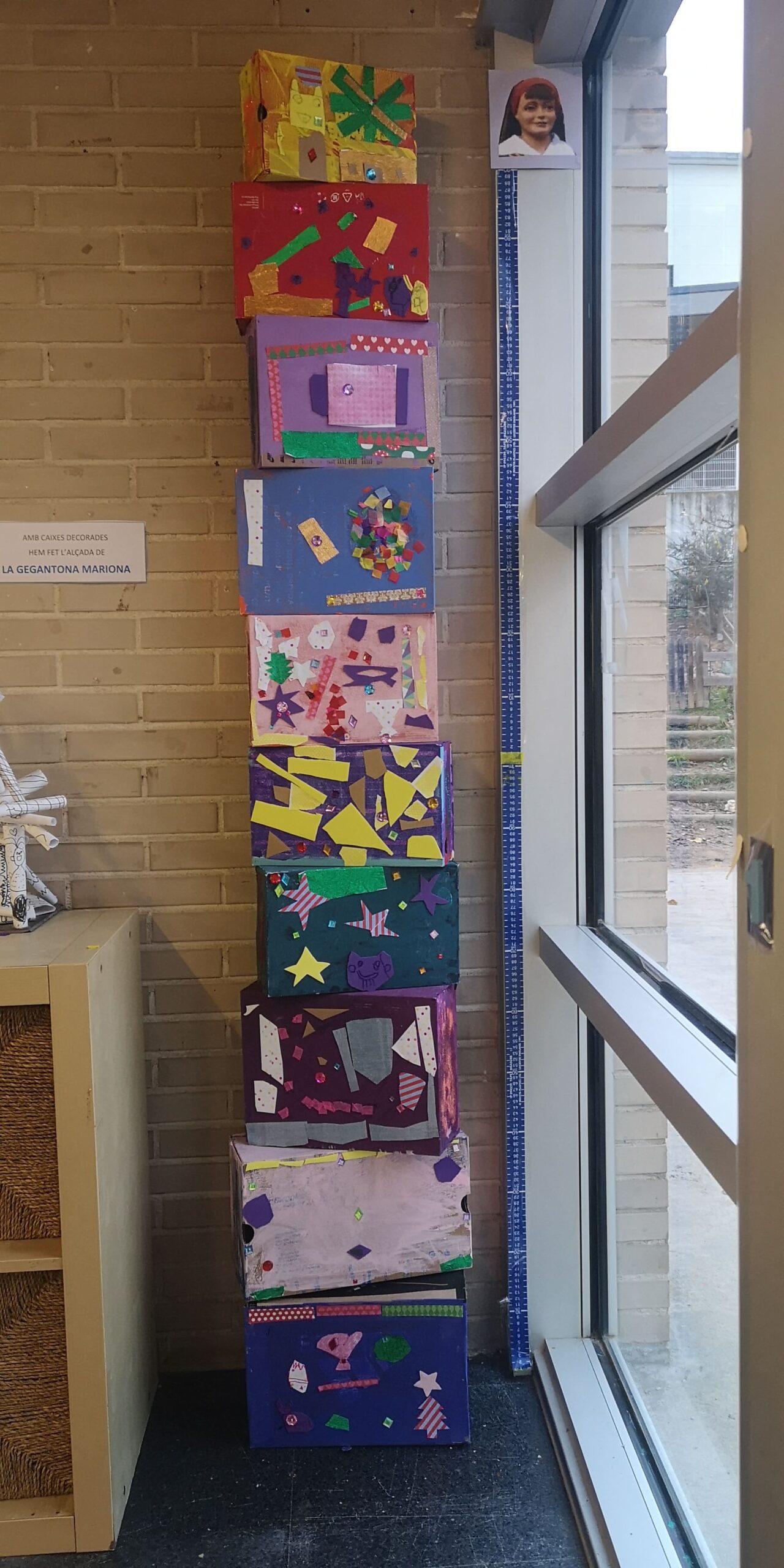 Volem reproduïr l’alçada de la gegantona, aixà que mirem quantes caixes necessitarem per fer 2 metres, Tot seguit les pintem i decorem.