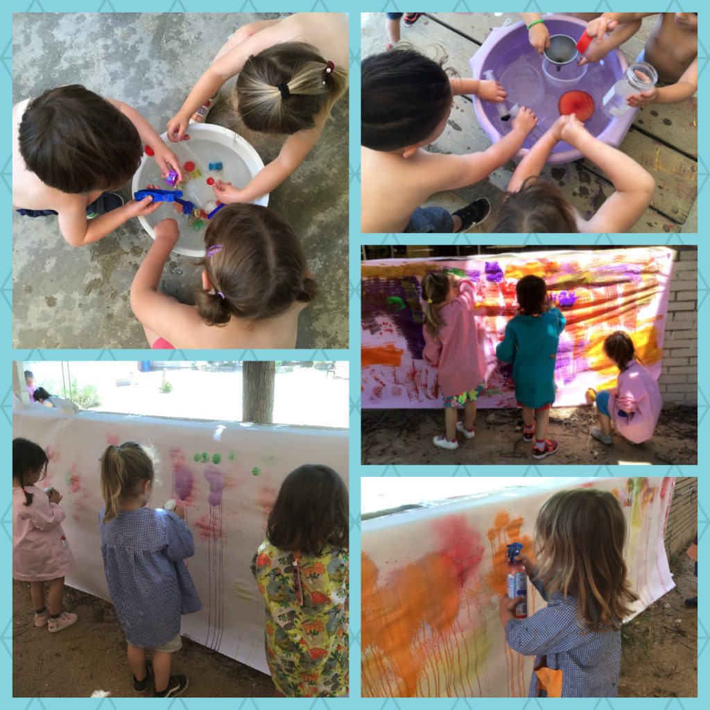 FALTEN MOLT POCS DIES PERQUÈ S’ACABI EL CURS I COMENCIN LES VACANCES! AQUESTS ÚLTIMS DIES HEM APROFITAT PER PINTAR DE MANERES DIFERENTS QUE ENCARA NO HAVIEM PROVAT. HEM FET SERVIR ESPRAIS, RODETS I GLOBUS. TAMBÉ HEM JUGAT AMB AIGUA. HEM AGAFAT CUBELLS I MATERIAL DIVERS PER FER PASSAR L’AIGUA D’UN LLOC A L’ALTRE, BUSCAR PETXINES I TRESORS AMAGATS… ENS HO HEM PASSAT D’ALLÒ MÉS BÉ!!