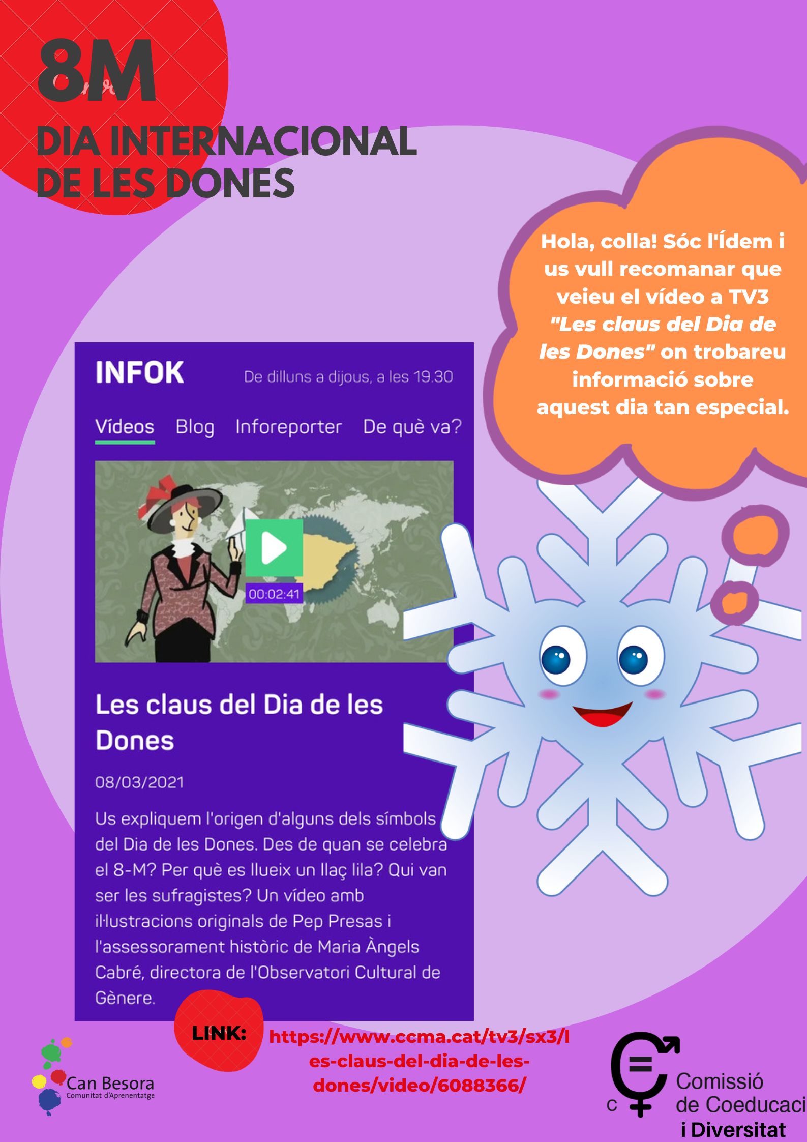 Avui és el Dia Internacional de les Dones, un dia reivindicatiu molt important per a nosaltres. Des de la Comissió de Coeducació i Diversitat, a través de la nostra mascota, l’Ídem, us anirem fent propostes per reflexionar sobre aquesta jornada. Per trencar estereotips i barreres que han invisibilitzat les dones durant molts i molts anys. Per una educació en igualtat, respecte, convivència i solidaritat.