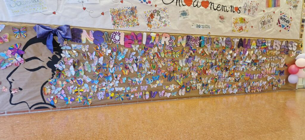 – Infants, famílies i docents han participat de la confecció d’un mural col•laboratiu 🦋🦋🦋,al vestíbul de l’escola, en què es posa de manifest la importància de la llibertat humana; tot impulsat per la comissió COCO i la coordinadora COCOBE del centre.