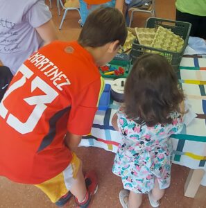 Però la darrera estona que vàrem compartir va consistir en fer conjuntament una manualitat, doncs els infants d’I4 estàvem treballant una artista, la Judith Scott, i volíem fer una escultura utilitzant materials ben diversos: material de rebuig, llana… i els nostres padrins i les nostres padrines ens van donar un cop de mà.
