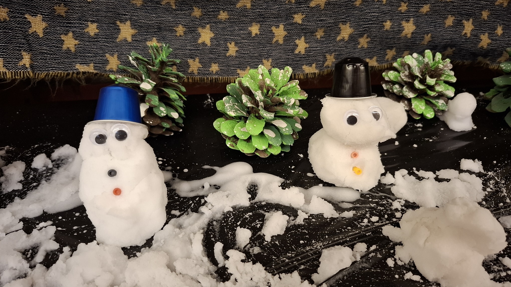 Doncs sí! hem vist com ha fet una reacció convertint-se en una massa blanca semblant a la neu. I hem creat un paisatge d’hivern. Mireu quins ninotets de neu tan simpàtics!