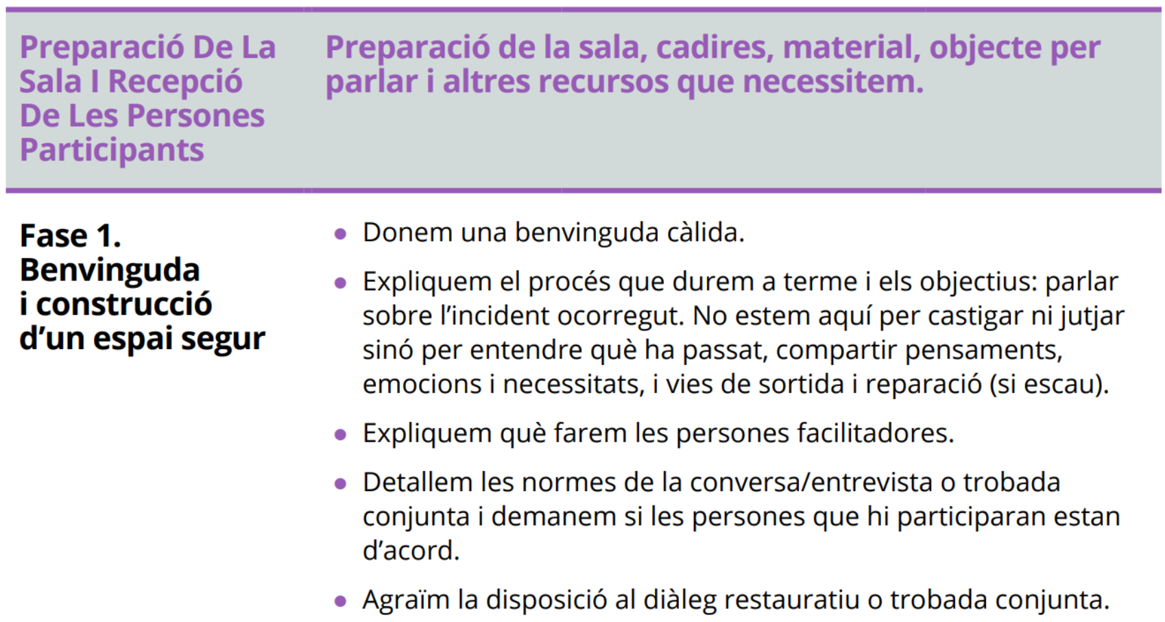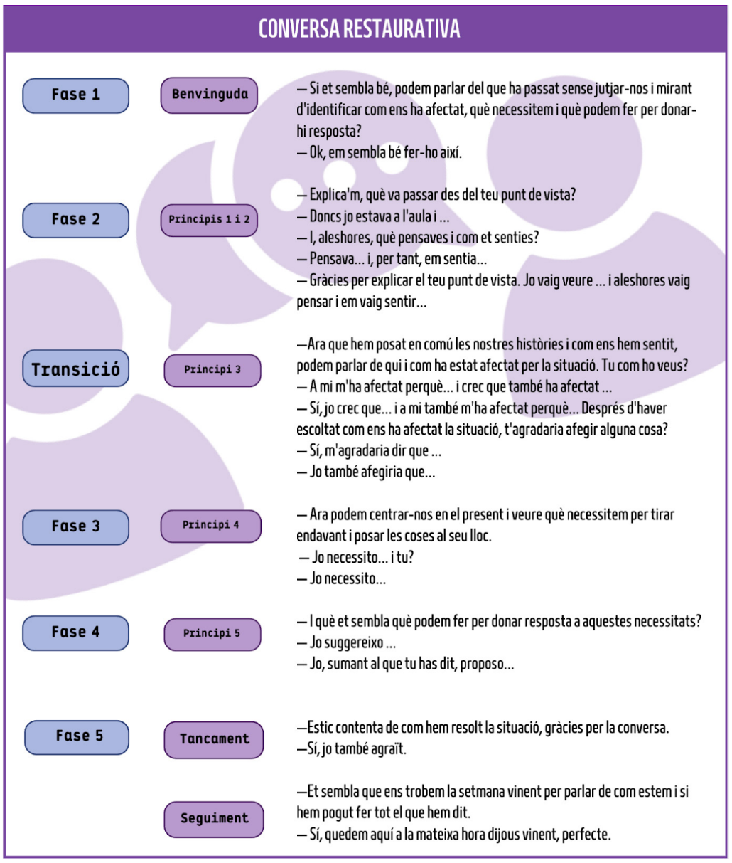 El full de reflexió restaurativa Abans de tenir una conversa restaurativa està bé entrar en la zona restaurativa i utilitzar la reflexió restaurativa. A la vegada, potser caldrà donar temps a l’altra persona per reflexionar abans de seure’ns a parlar. Per poder tenir una conversa restaurativa abans hem de regular-nos, estar connectats i connectades i en condicions de poder pensar i raonar. No és adient tenir converses quan estem desbordats o desbordades emocionalment. Per això és interessant disposar d’un full de reflexió restaurativa que inclogui les preguntes. El full de reflexió restaurativa disposa de la versió (A) per l’alumnat autor dels fets i de la versió (R) per l’alumnat receptor i està pensat per a emplenar-lo a mà per part de l’alumnat implicat. En cas d’alumnat d’edats més tempranes o que presenti dificultats per escriure, l’equip educatiu formula les preguntes oralment a l’alumnat i anota les respostes al full corresponent. També és important tenir les cartes de necessitats a disposició de tothom. La trobada conjunta o reunió restaurativa Un cop hem fet les entrevistes prèvies i avaluat la idoneïtat de fer una trobada conjunta, ens disposem a realitzar-la seguint sempre les fases i les preguntes de l’escolta restaurativa. La trobada conjunta consta dels següents moments: