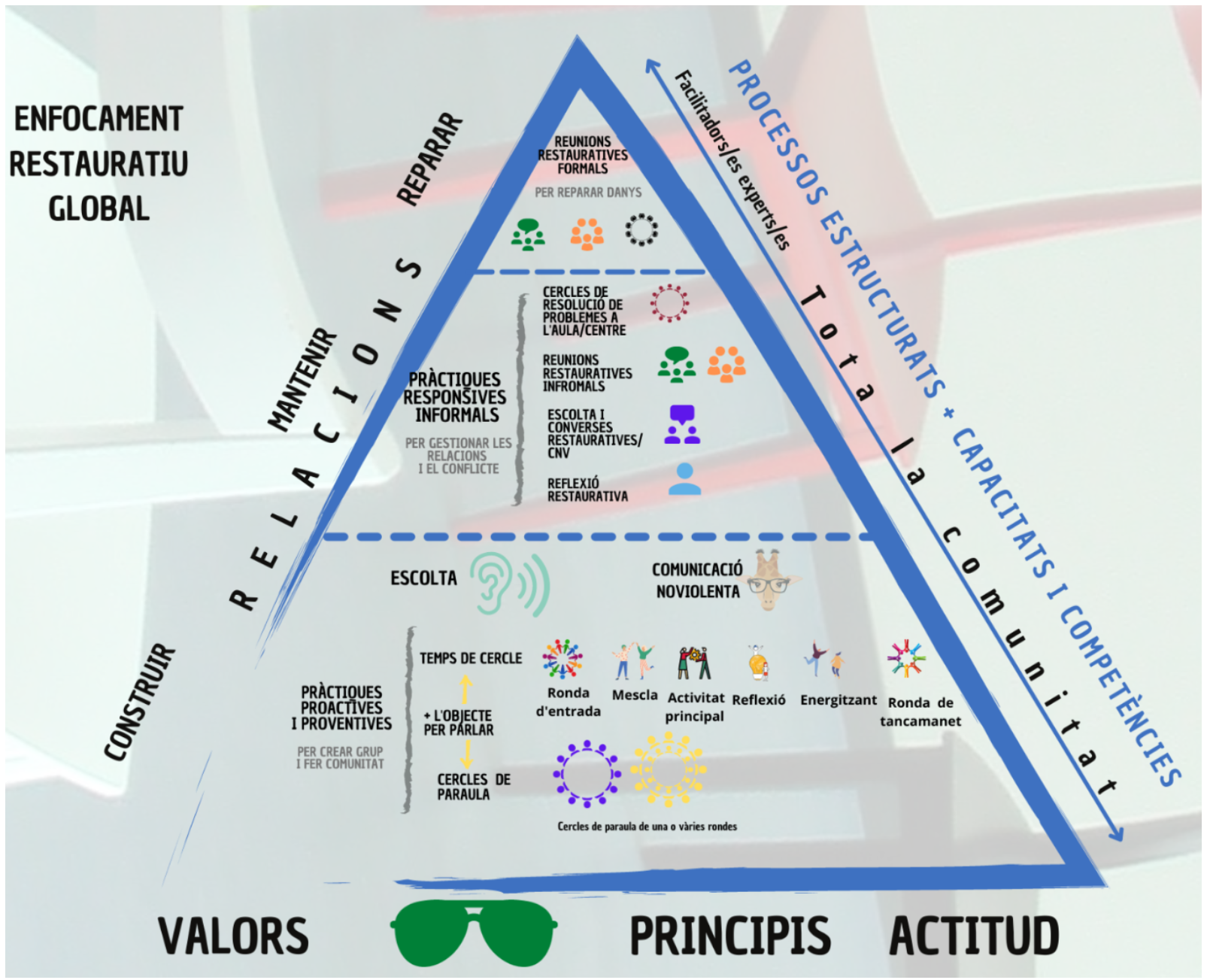 La piràmide restaurativa La piràmide restaurativa serveix per descriure tot el que es planteja des de l’ERG. El desplegament de l’enfocament que s’està promovent des de Catalunya en l’àmbit escolar no se centra només a donar resposta als danys, incidents i conflictes, sinó que inclou l’element relacional i proactiu. De fet és el que ocupa la part més gran de la piràmide, per tant, es proposa treballar a tres nivells: construir, mantenir i reparar relacions i danys, si n’hi ha.