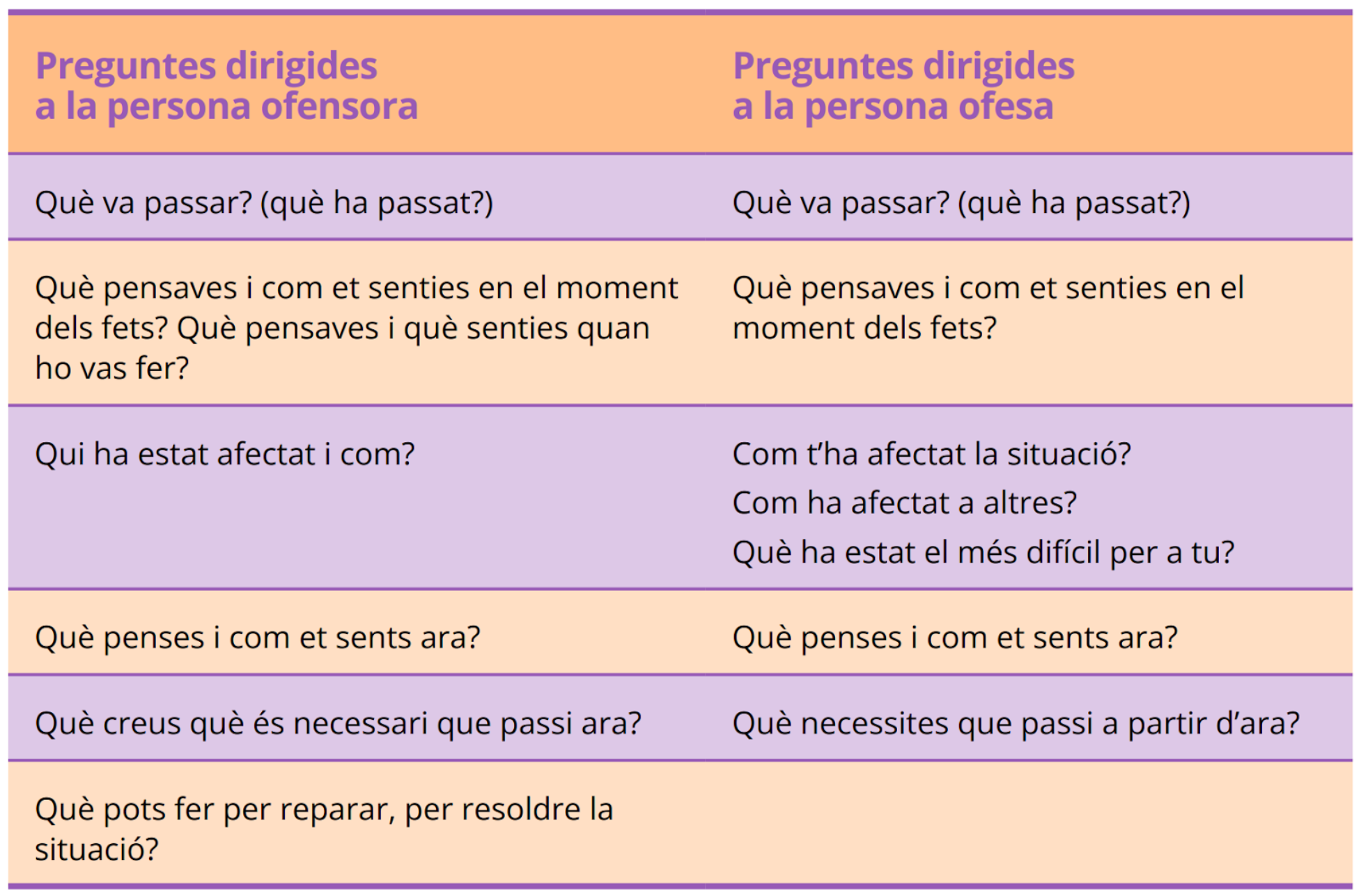 Les preguntes són eines que ens permeten mantenir-nos en la zona restaurativa i faciliten l’escolta i la comunicació empàtica i és aquí on rau el seu valor. |