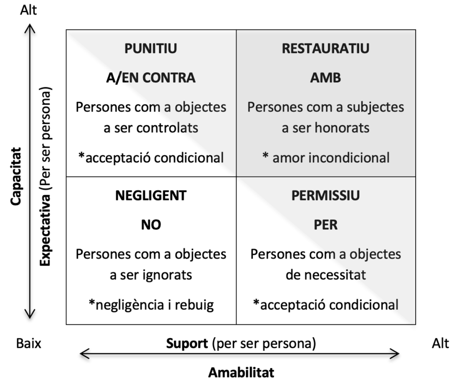 El quadrat L’última figura geomètrica que ens serveix per explicar l’ERG és el quadrat que simbolitza la finestra relacional definida per D. Vaandering (2015). La finestra relacional posa en relació dues coordenades o variables, les expectatives a què els altres puguin desenvolupar-se com a persones i, per tant, inclou també l’exigència i la responsabilització i, d’altra banda, la coordenada horitzontal que s’explica per la capacitat de donar suport (ser amables) a l’altre per tal que es pugui desenvolupar com a persona. La finestra relacional aporta un marc per poder reflexionar com orienten les relacions i la gestió de les faltes, incidents i conflictes: