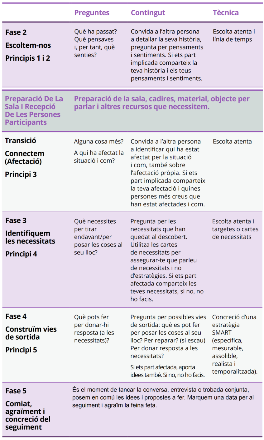 Per valorar aquests indicadors i valorar la viabilitat d’una reunió restaurativa durem a terme converses o entrevistes restauratives prèvies utilitzant la tècnica de l’escolta restaurativa amb totes les seves fases: benvinguda, història, transició i afectació, necessitats i propostes de gestió (que pot ser la trobada conjunta). La conversa o entrevista restaurativa Entenem per conversa restaurativa aquella que es fonamenta en els 5 principis restauratius, i en la que utilitzem la tècnica de l’escolta restaurativa. Les converses restauratives són un “ball d’escolta” on cadascú és el responsable d’uns dels passos a fer i on no participa una tercera persona facilitadora sinó que són les mateixes persones implicades en un conflicte les que, emprant les preguntes restauratives, per separat, miren de posar en comú què ha passat, què pensen i com se senten, com els afecta la situació, què necessiten i què poden fer per donar-hi resposta: