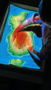 El programari utilitzat (GitHub) permet configurar els colors a projectar i també oferir animacions en directe com les corbes de nivell (que utilitzaran més endavant els alumnes de la comunitat de grans) o animals en funció del terreny (peixos a l’aigua o conills als prats) per l’experimentació a petits.