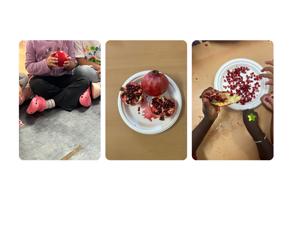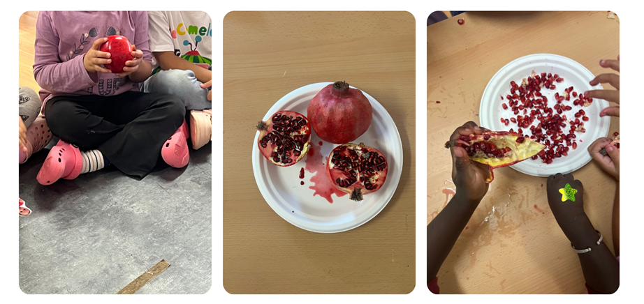 Aquesta dies, els infants d’I4 estan vivint una experiència sensorial molt especial: han pogut observar, tocar, olorar i tastar diferents fruits de la tardor com la magrana, el caqui i el moniato.