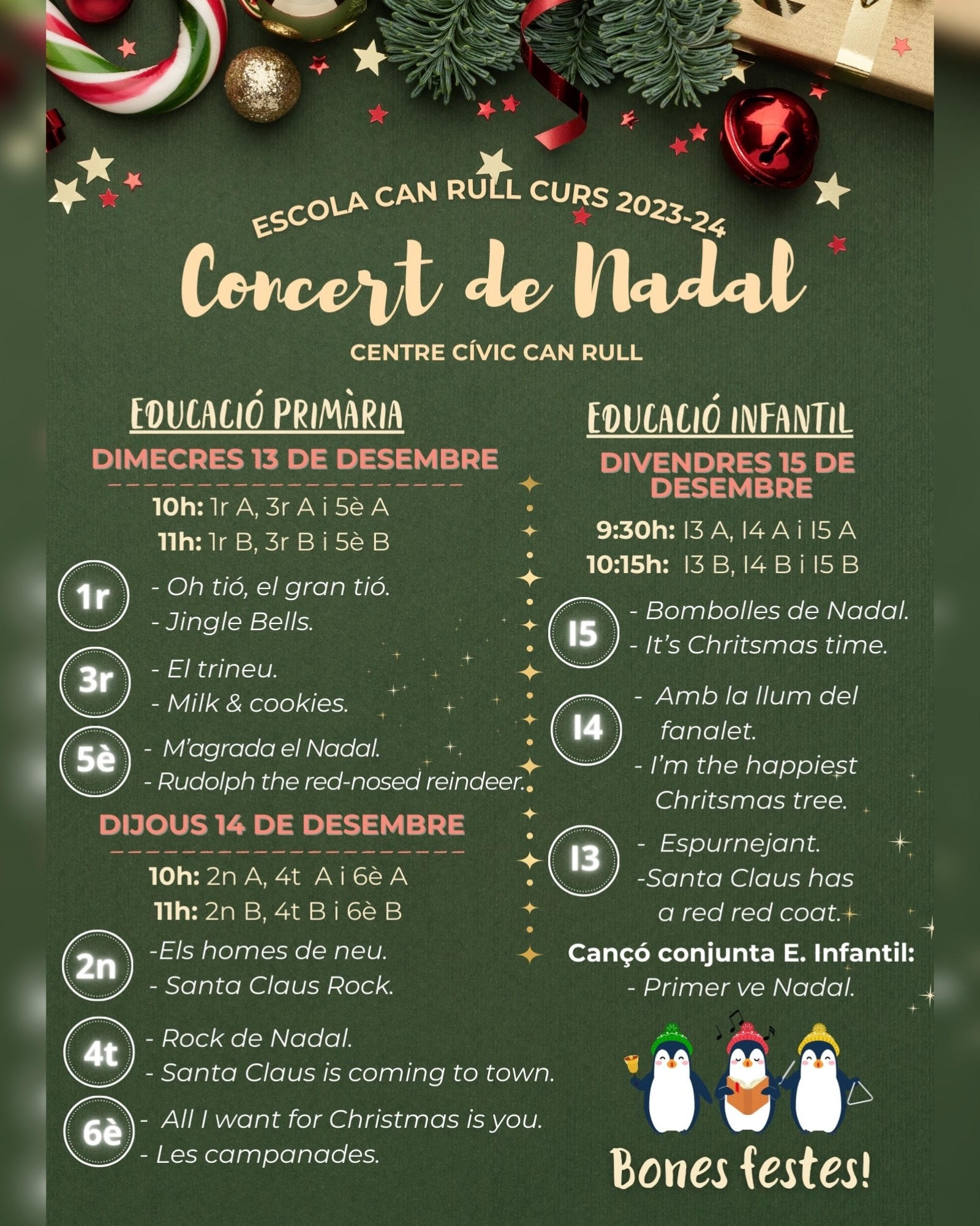 Els propers 13, 14 i 15 de desembre es celebrarà la tradicional cantada de nadales de l’Escola al Centre Cívic de Can Rull!