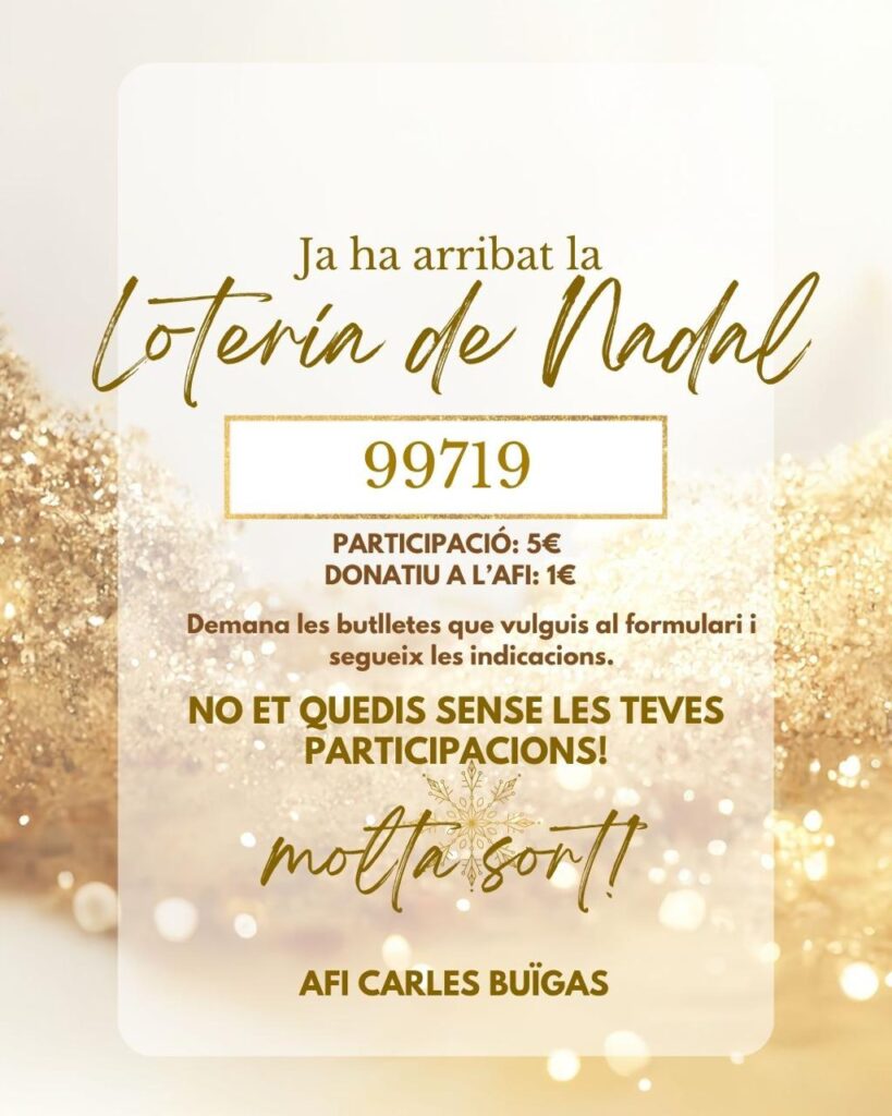 👉 PREU: 5,00 € per butlleta (4€ de participació + 1€ col·laboració per l’AFI)