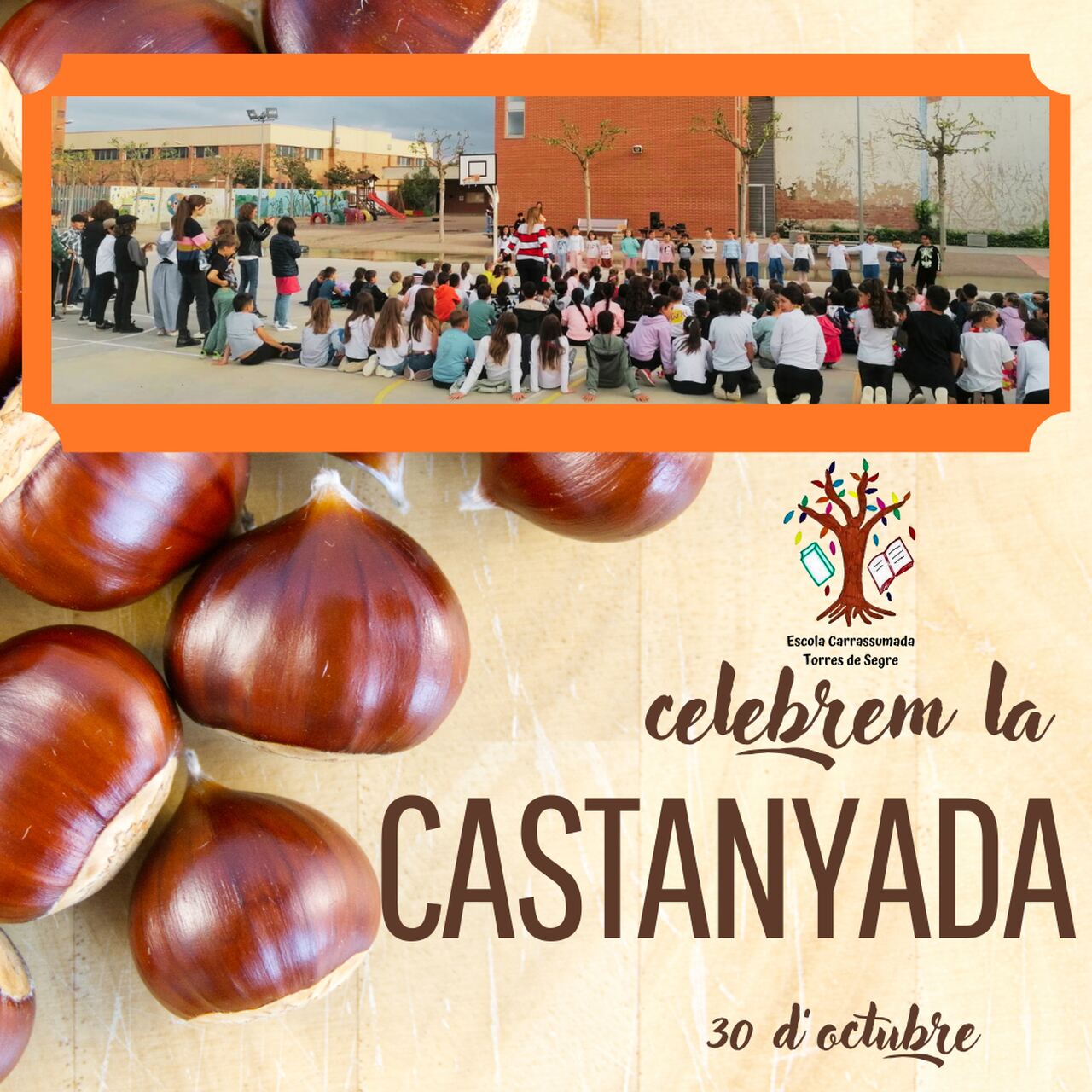 04/11/24El dia 30 d’octubre els nens i nenes de l’escola vam gaudir d’una tarda cantant i ballant cançons de la castanyada! després les castanyeres i castanyers de 6è ens van repartir les paperines amb castanyes que havien cuit les famílies de l’AFA.