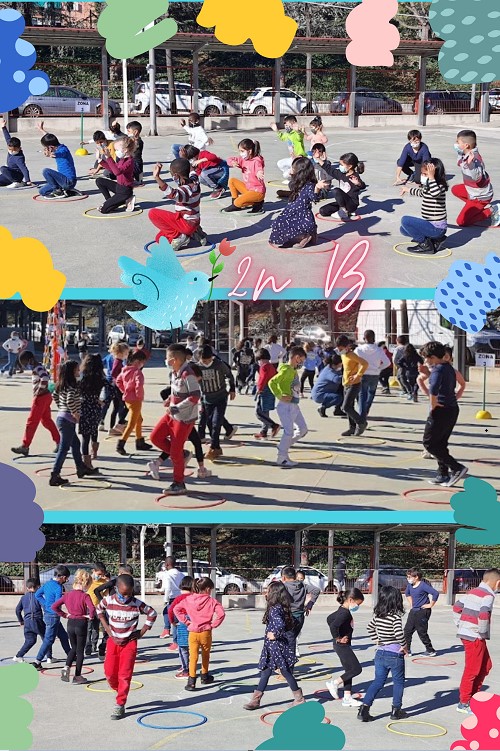 Amb un sol radiant i daurat com milers de fils d’or, tots els nens i nenes de 1r i 2n ens hem trobat al pati (cada grup a la seva zona assignada) per tal d’explicar-nos quin missatge de la Pau cada classe havia elaborat. Tot seguit, l’hem penjat a l’arbre de la Pau i finalment hem ballat i cantat la cançó “JO VULL JUGAR” del grup musical La Clika.