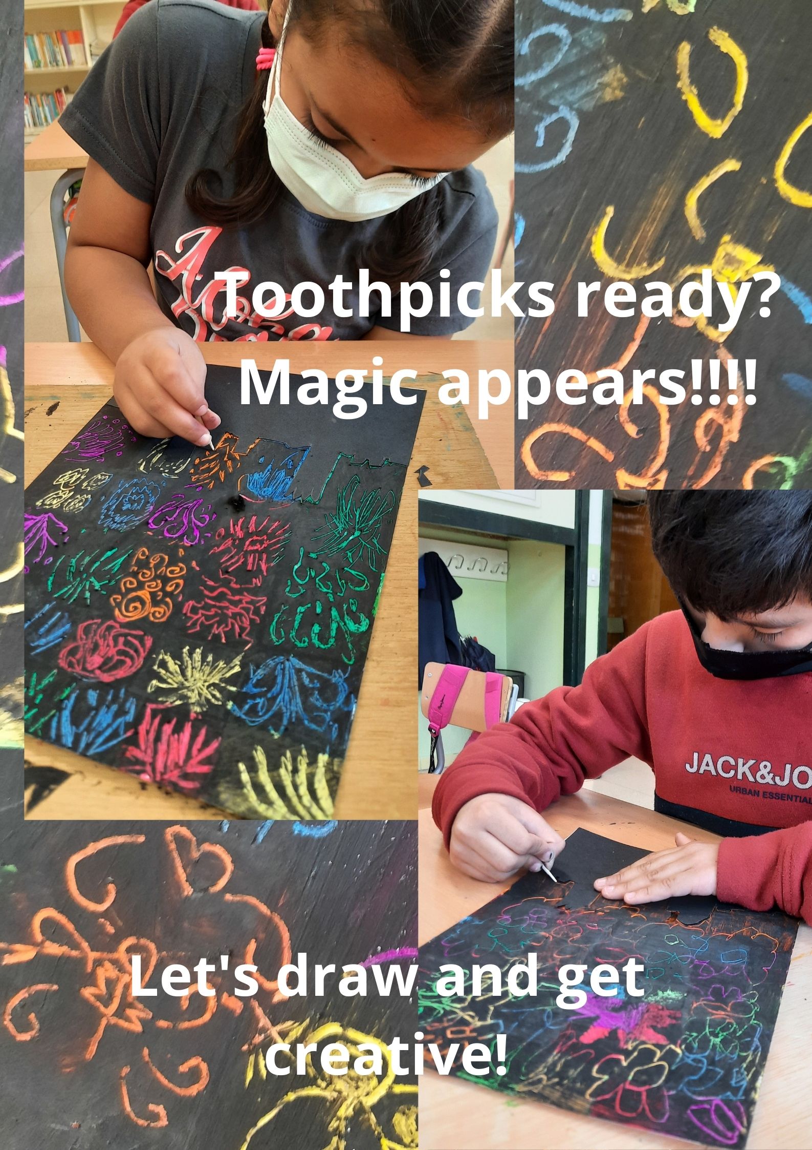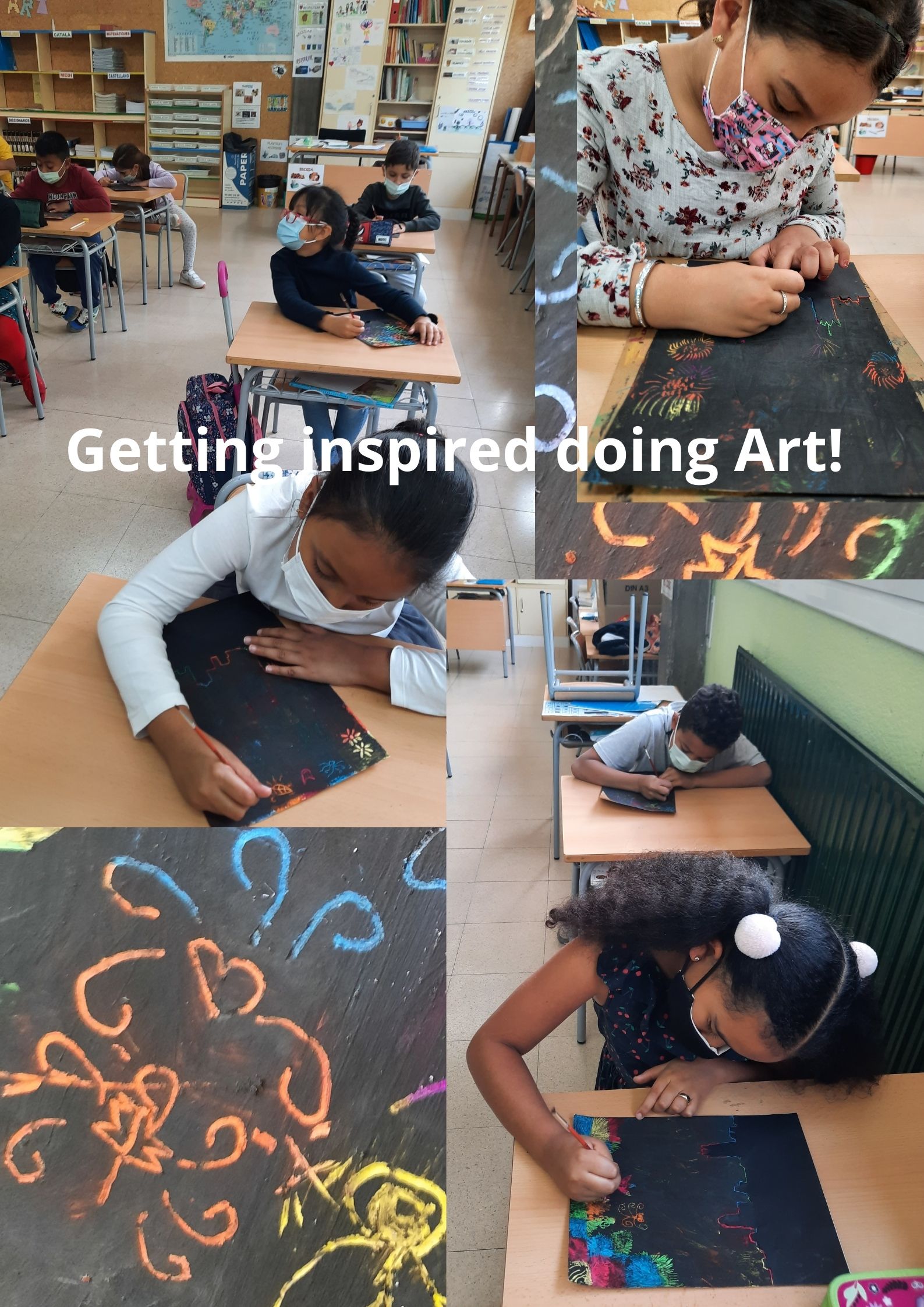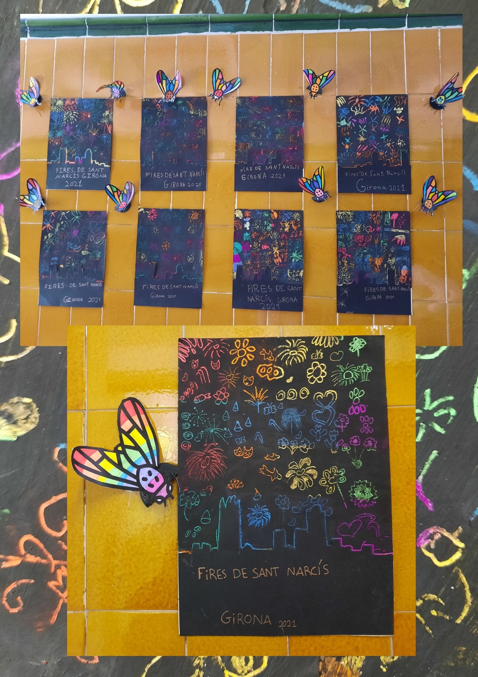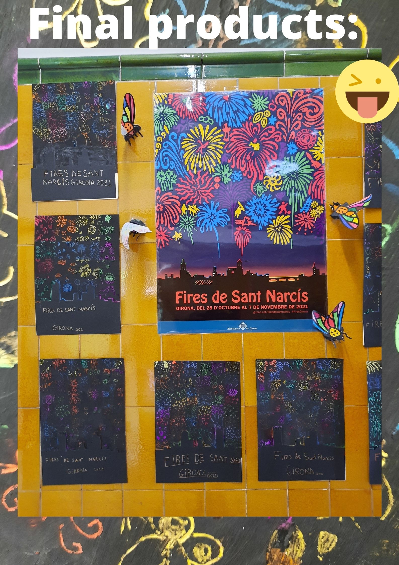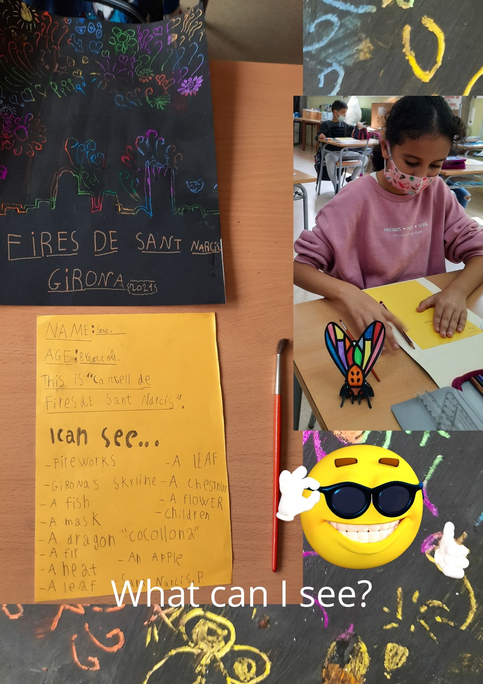 • Cartell de Fires de Sant Narcís  (FAIR POSTER) using wax, opac black paint, toothpicks, black cardboard for Girona’s skyline, scissors and glue. We draw lots of things and we discovered in the picture hidden drawings such as masks, fire works, a heart, Cocollona’s dragon, chestnuts, flowers, an apple, a leaf, Sant Narcís Protector of Girona, a fly, …