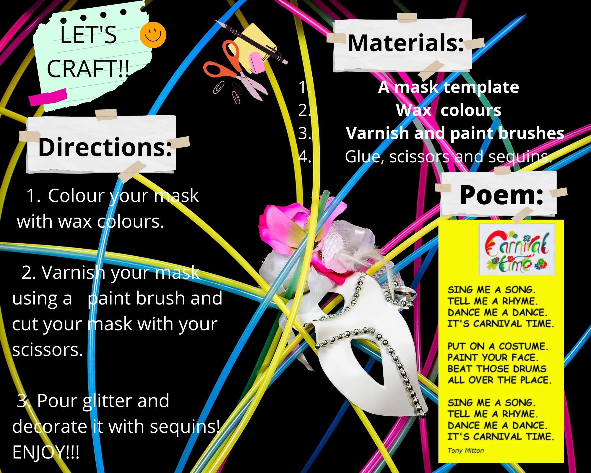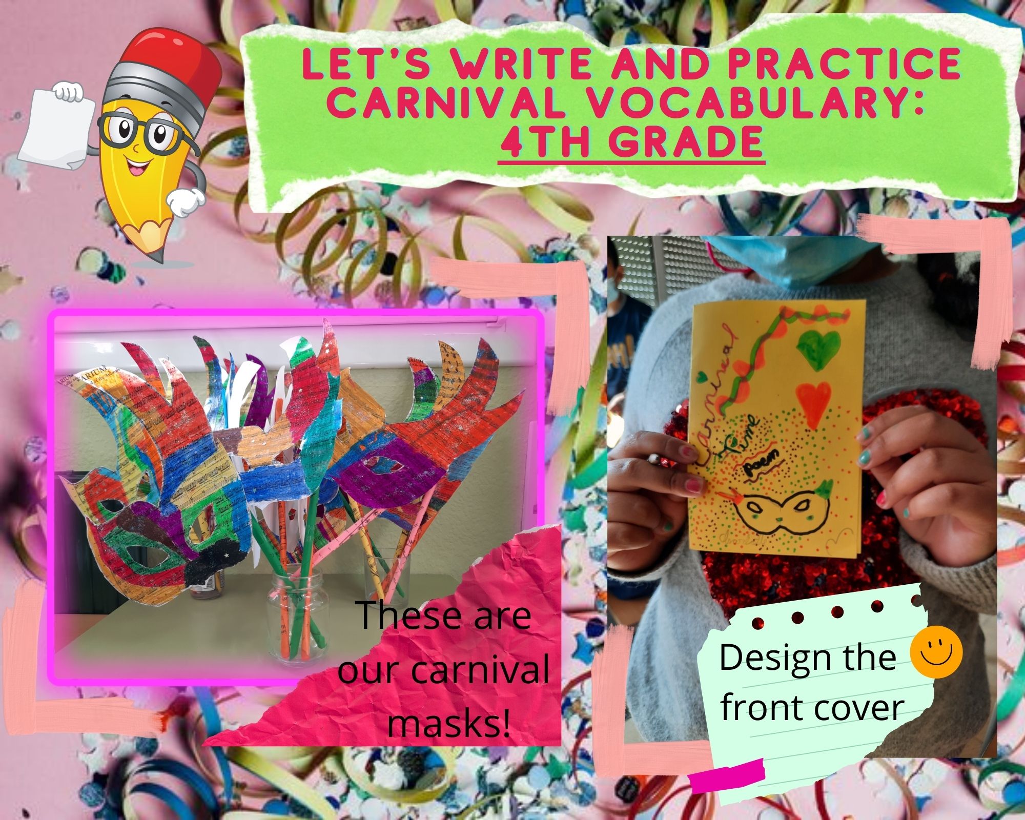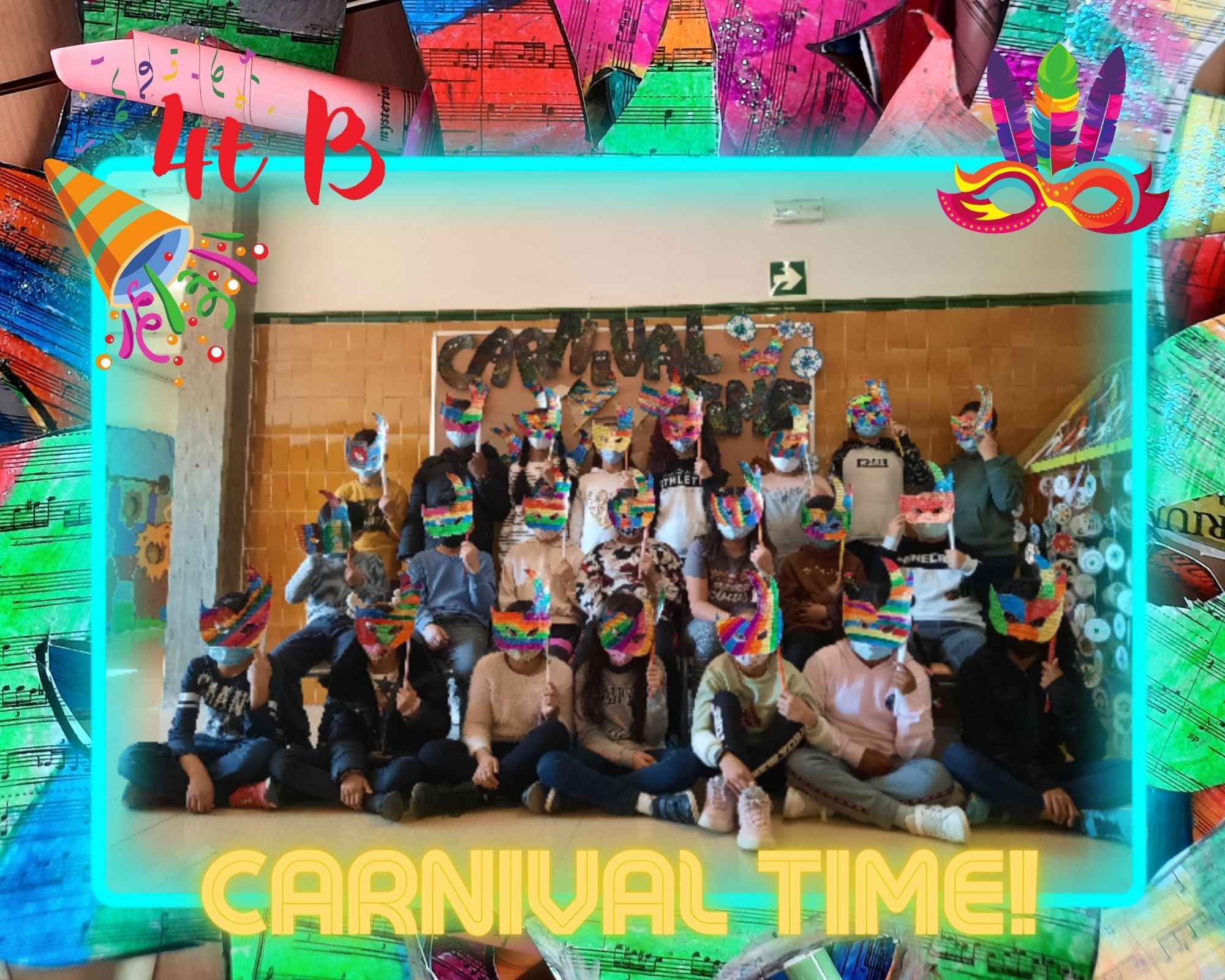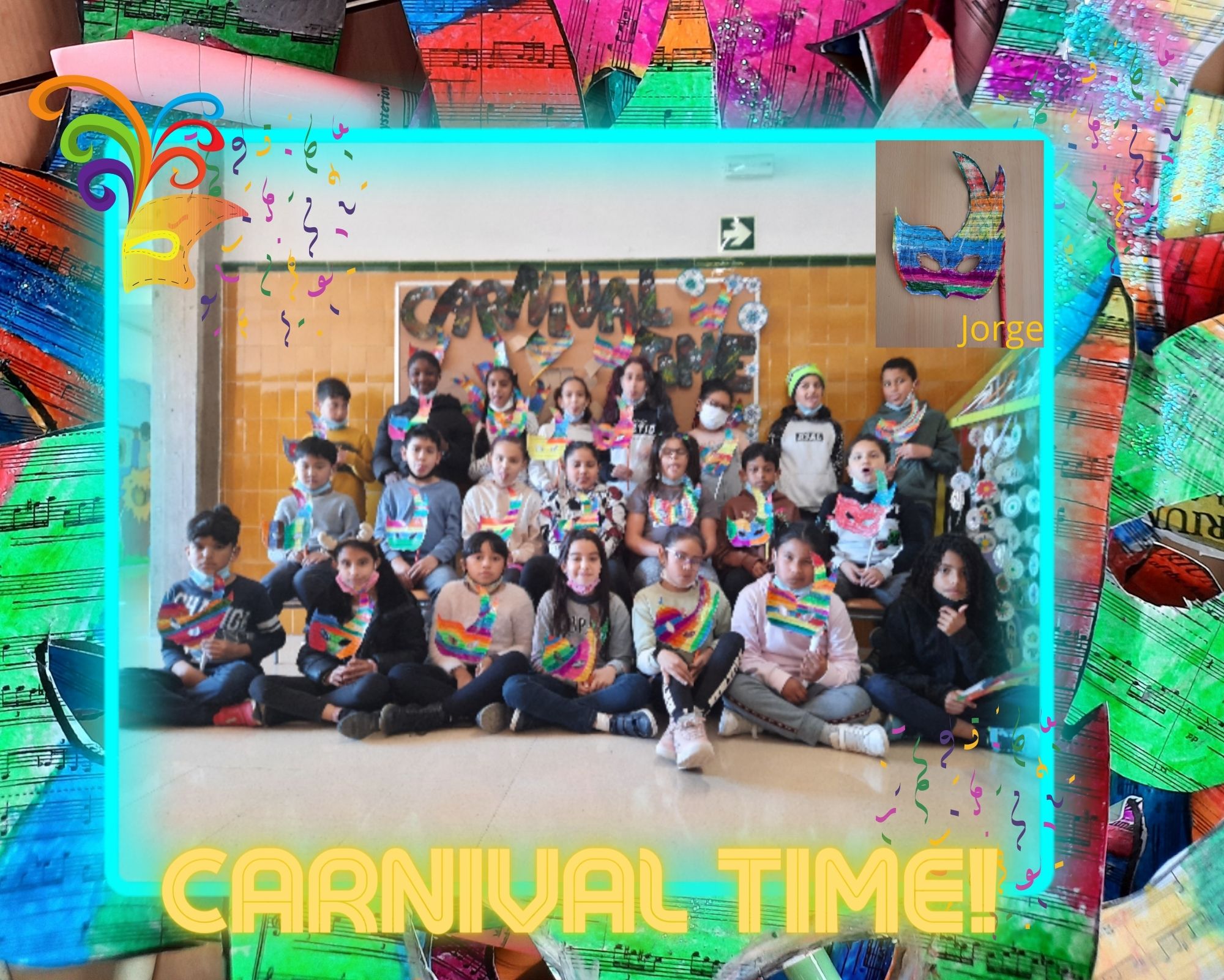 Des de l’àrea de plàstica en anglès🎨, els nens i nenes de tercer i quart us volem ensenyar unes màscares que hem realitzat al detall. També, hem treballat el vocabulari i les instruccions (written production📝) necessàries per crear la màscara i ho hem complementat fent un poema que hem après i practicat a l’aula (oral focus😃) anomenat “It’s Carnival time!“.
