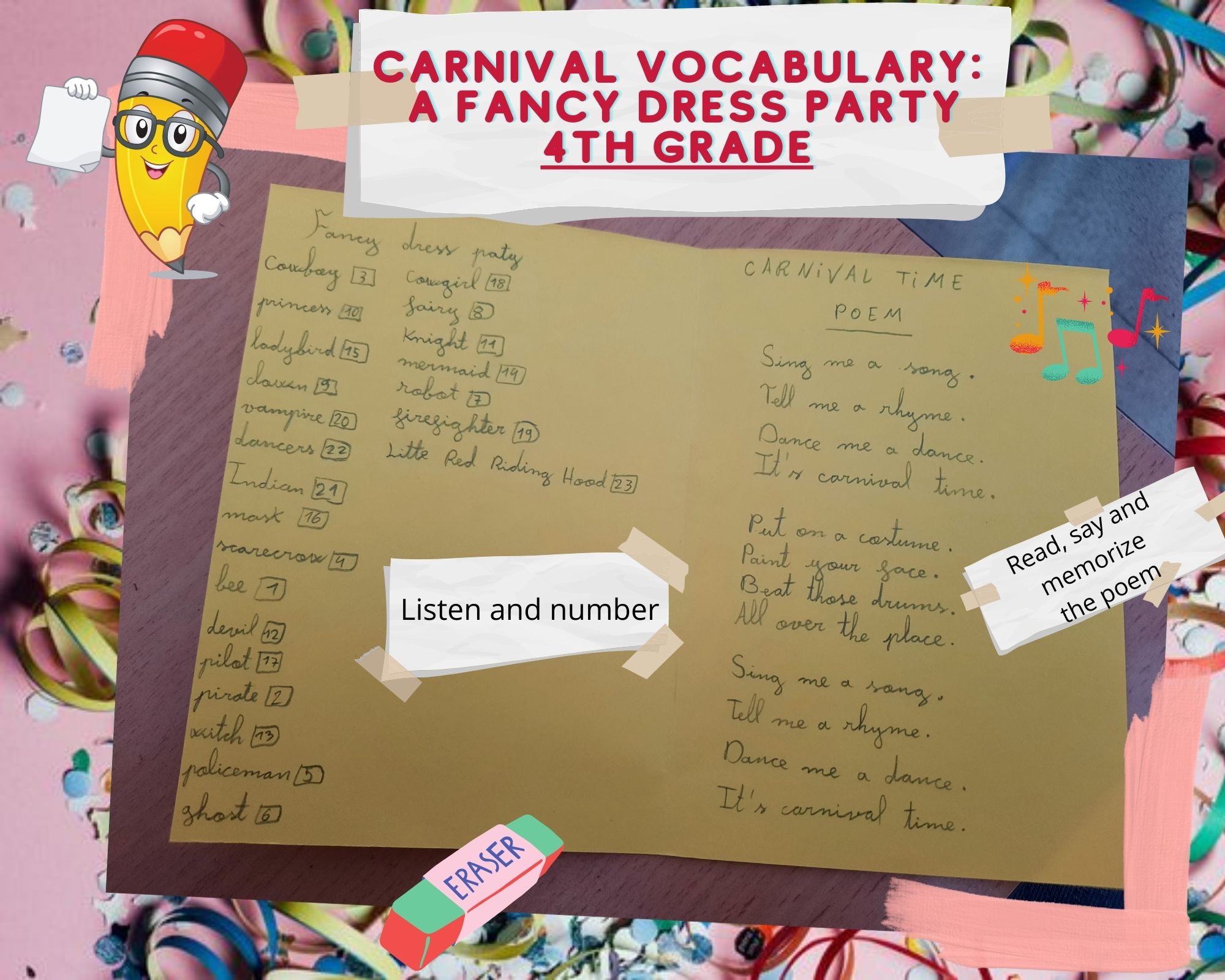 També, a través d’un “minibook”📜 hem reforçat el llenguatge escrit d’aquesta manualitat i l’escolta activa (active listening) de la temàtica de carnaval (costumes -disfresses-, dressing up -disfressar-se-, I am wearing…a green coat, blue trousers👖, red shoes, an orange hat…Who am I❓ – Porto un abric verd, pantalons blaus, sabates vermelles, un barret taronja…qui sóc?) tot jugant amb unes fitxes interactives, visualització d’un vídeo i cançons del topic Carnival.