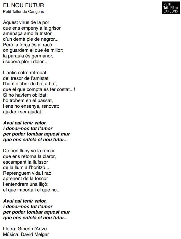 Escolteu la cançó d’ El nou futur i canteu-la, us he posat una imatge amb la lletra perquè la pugueu cantar més fàcilment. Podeu fer un dibuix ben bonic que representi la cançó!!!